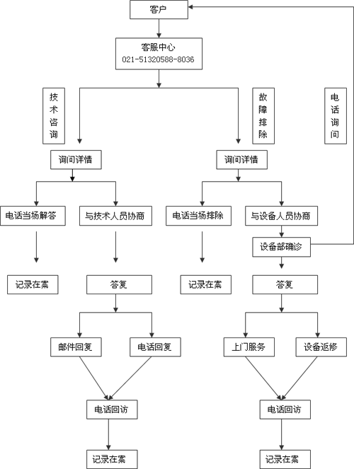 - 對客戶來電反映儀器設備問題,技術支持部負責商務接洽,第一時間轉(zhuǎn)告維修部處理,維修部與客戶聯(lián)系,做出儀器損壞情況的判斷,并拿出處理方案進行故障排除和維修;維修后把詳細情況和處理結果告知技術支持部。